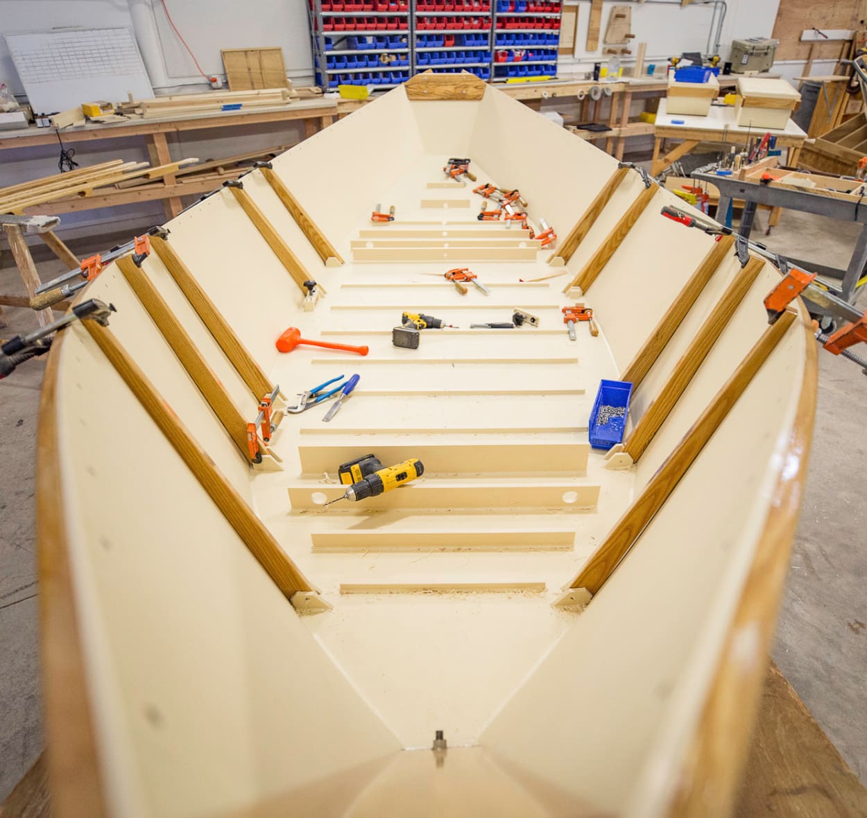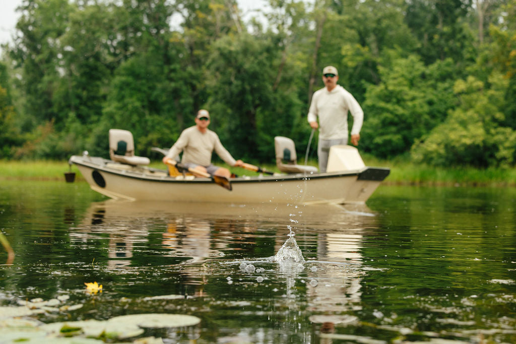 The combination of a wider bottom width and beam, a long wet line, and our pronounced chines allows the River Skiff to hold its line with little effort. This makes it the ideal boat for battling wind and maintaining a predictable drift on slow-moving water.